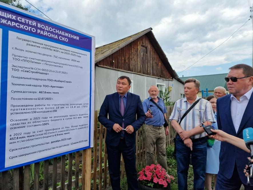 Глава северного региона во время рабочей поездки отметил, что на сегодня из 635 сёл области централизованным водоснабжением обеспечено 406 сел, в которых проживают порядка 240 тысяч сельского населения области. На работы по водоснабжению и водоотведению направлено более 12 миллиардов тенге. В селе Якорь Кызылжарского района проживают чуть более 2000 человек и проблему с перебойной подачей воды испытывают не первый год. Реконструкция сети водоснабжения здесь началась еще в декабре 2021 года и по словам Кумара Аксакалова на данный момент подрядчик выполнил работы на 75%.