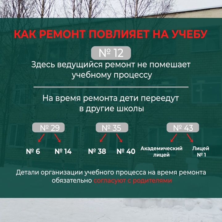 Мэр карельской столицы отметила, что ремонт будет невозможен без неудобств. Учеников школ №29, 35 и 43 переведут в другие учреждения, а в школе №12 ремонт будут совмещать с занятиями. Подробнее на фото: