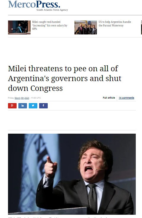 Merco Press: Милей пригрозил устроить сеанс уринотерапии непокорным губернаторам Аргентины и закрыть Конгресс