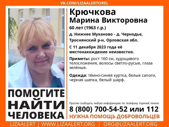 Женщину зовут Марина Викторовна Крючкова. Ей 60 лет. В ориентировке указали два населённых пункта. Это деревни Нижнее Муханово и Чернодье. Обе находятся в Троснянском районе. Очевидно, женщина может находиться в одной из этих деревень или в пути между ними.