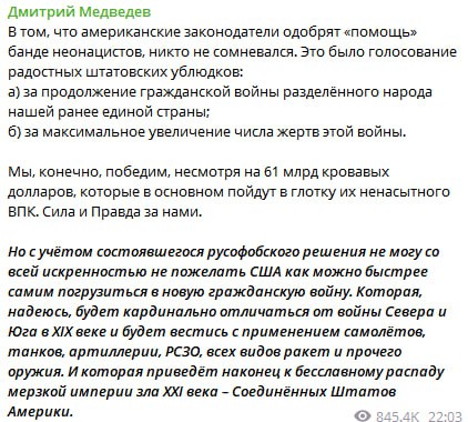 Медведев пожелал Штатам гражданскую войну за новый пакет помощи Украине