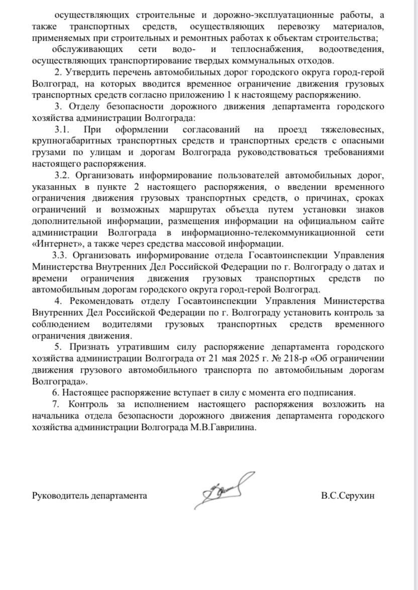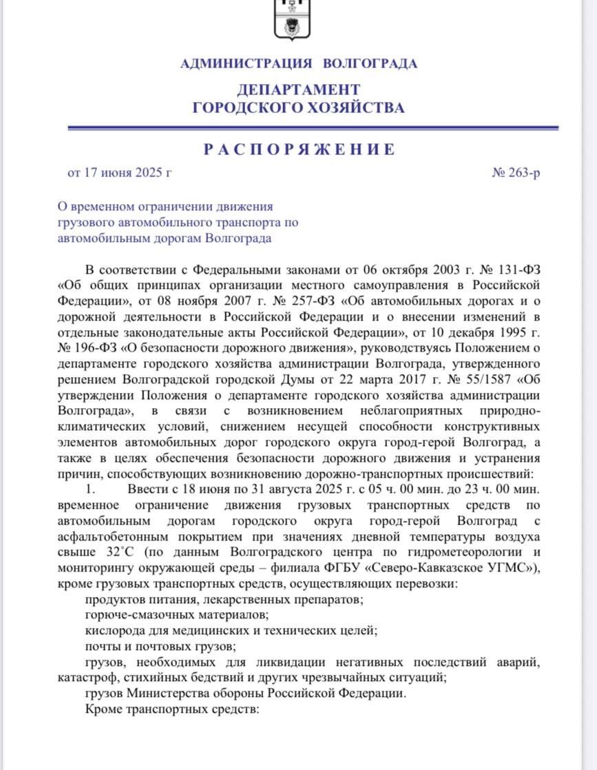 17 июня Департамент городского хозяйства администрации Волгограда выпустил новое распоряжение. Теперь (с 18 июня) запрет на проезд по Волгограду большегрузов действует только при температуре свыше +32°C (с 26 мая ограничения действовали без учета температурного режима). А фурам с определёнными грузами разрешён въезд и днём при любых погодных условиях.