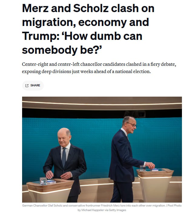 Politico: Кандидаты на должность канцлера столкнулись в ходе жарких дебатов, обнажив глубокие разногласия за несколько недель до национальных выборов. Одно из самых крупных разногласий - как вести себя в возможной торговой войне с США.