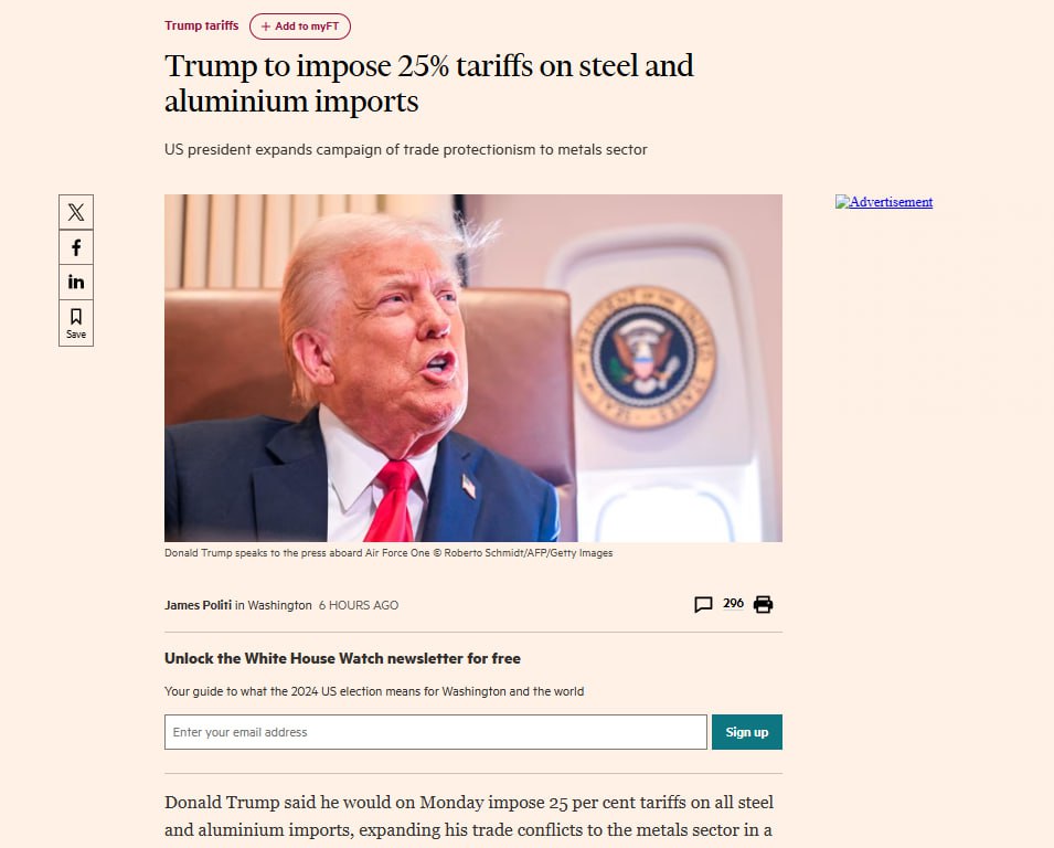 Financial Times: Введение Трампом 25-процентных пошлин на сталь и алюминий - новая вспышка протекционизма со стороны Вашингтона, которая может вывести из равновесия мировые рынки.