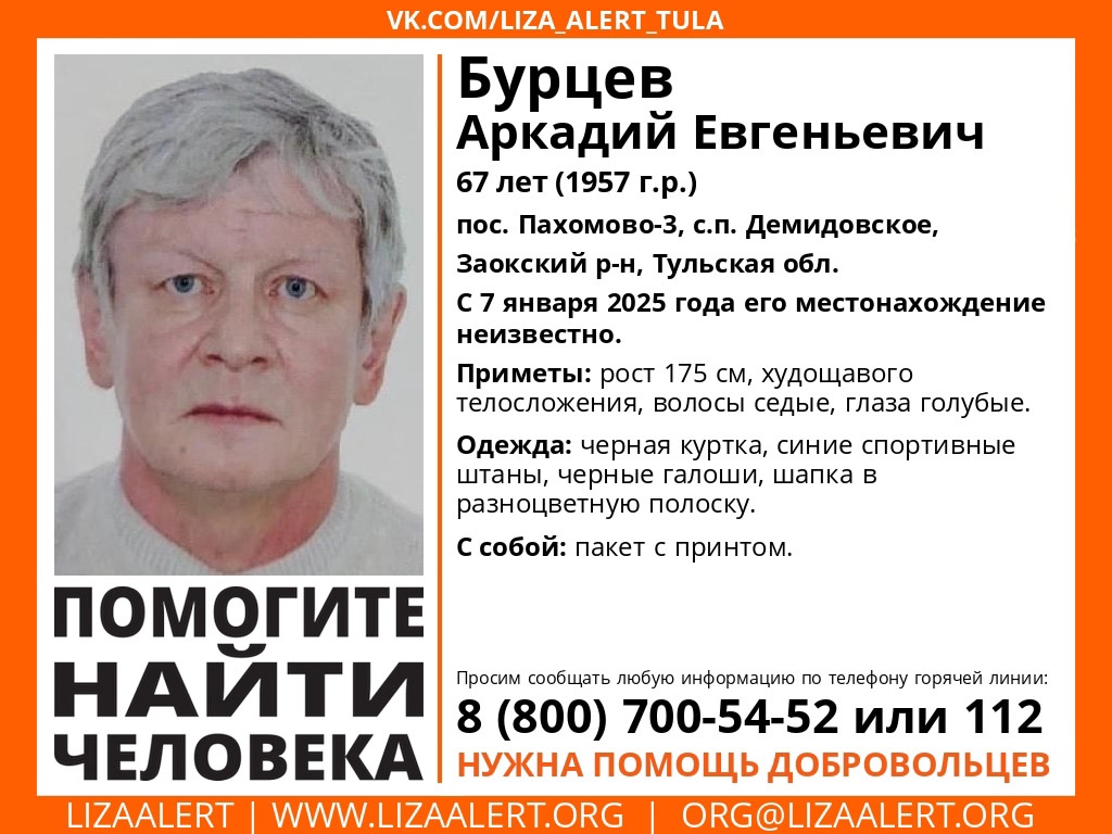 В Заокском районе Тульской области пропал 67-летний житель поселка Пахомово-3 Аркадий Бурцев.