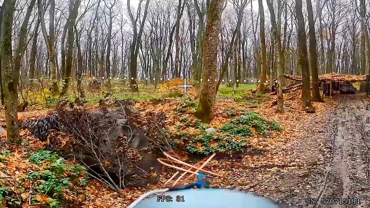 На видео - запись с камеры FPV-дрона, движущегося вдоль узкой дороги. В кадре типичный лесной пейзаж - осенняя поросль, мокрый грунт и густые заросли. Слева от дороги видно вписанное в рельеф лесополосы укрепление противника.