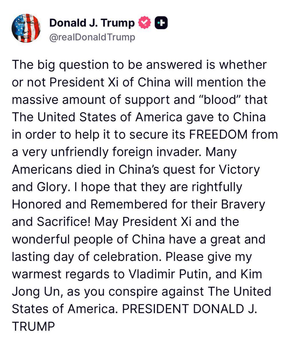 "Главный вопрос, на который предстоит ответить, заключается в том, будет ли председатель КНР Си Цзиньпин упоминать о огромной поддержке и «крови», которые Соединённые Штаты Америки оказали Китаю, чтобы помочь ему обрести СВОБОДУ от крайне враждебного иностранного захватчика. Многие американцы погибли, борясь за победу и славу Китая. Я надеюсь, что они по праву удостоены почёта и памяти за свою храбрость и жертвенность! Пусть председатель Си Цзиньпин и прекрасный народ Китая будут в этот великий и вечный день празднования. Передайте мои самые тёплые пожелания Владимиру Путину и Ким Чен Ыну, которые строят заговор против Соединённых Штатов Америки.