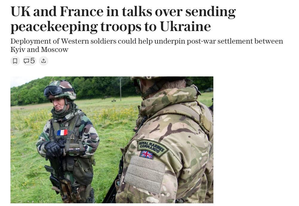 Одна из идей, которая сейчас все чаще обсуждается не только в публичных дебатах, но и за закрытыми дверями в Вестминстере, заключается в том, должны ли западные войска гарантировать какие-либо условия мира», - пишет The Telegraph.