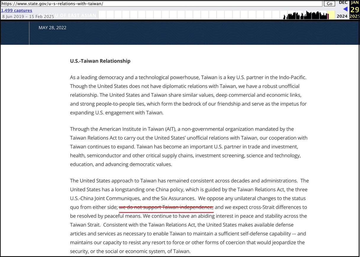 Часть, в которой говорилось «мы не поддерживаем независимость Тайваня», теперь удалена. Важно помнить, что всеобъемлющая политика США в отношении Тайваня и признание США Китая в качестве законного правительства в Китае, не признавая их суверенитета над Тайванем, еще не изменились.