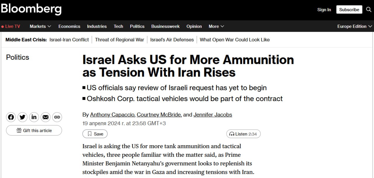 Как пишет Bloomberg, Тель-Авив запросил у Вашингтона боеприпасы, в том числе танковые снаряды. Запасы ЦАХАЛ пустеют из-за продолжающихся боевых действий в секторе Газа. Также израильской армии требуются «тактические машины».