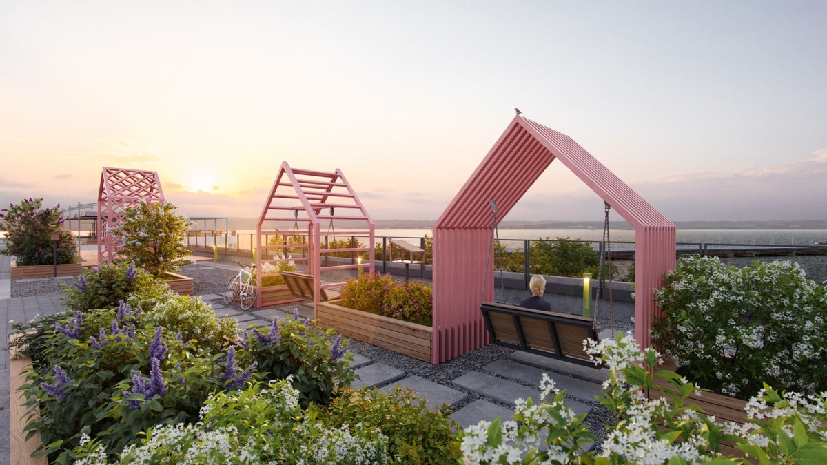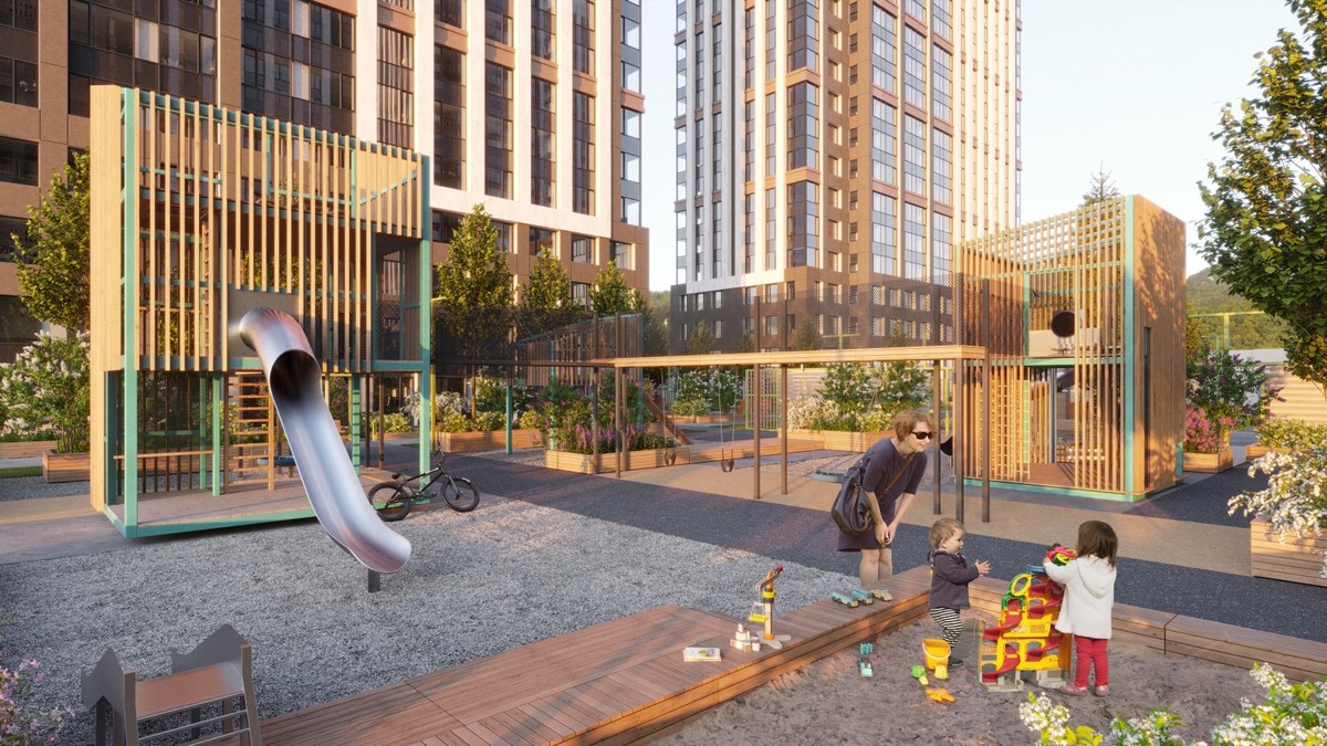 Жилой комплекс состоит из четырёх жилых домов, два из которых уже введены, большого подземного паркинга, в который можно спуститься на лифтах прямо со своего этажа, бизнес-центра и, что немаловажно, огромной придомовой территории, где каждый найдёт себе занятие по душе.