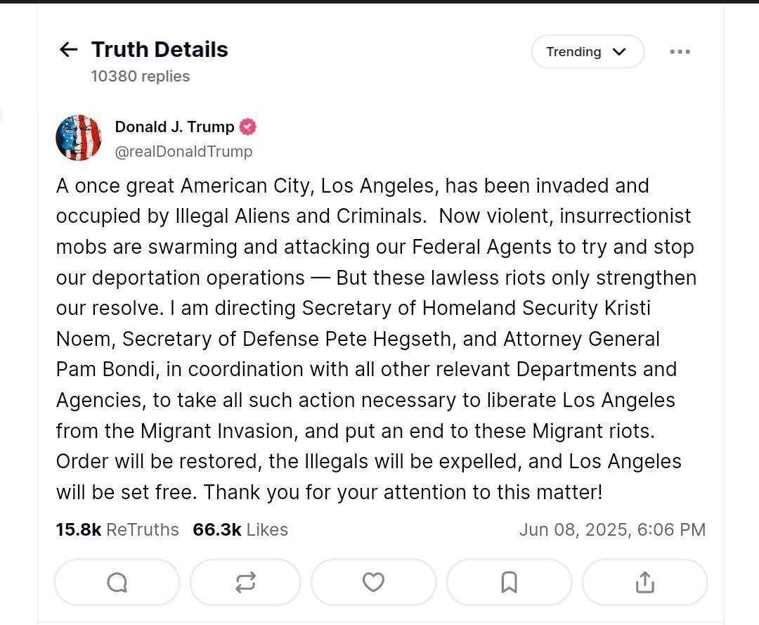 “Некогда великий американский город Лос-Анджелес был захвачен и оккупирован нелегальными иммигрантами и преступниками. Сейчас жестокие, мятежные толпы нападают на наших федеральных агентов, пытаясь помешать нашим операциям по депортации, но эти беззаконные беспорядки только укрепляют нашу решимость. Я поручаю министру внутренней безопасности Кристи Ноем, министру обороны Питу Хегсету и генеральному прокурору Пэм Бонди, в координации со всеми другими соответствующими ведомствами и агентствами, принять все необходимые меры для освобождения Лос-Анджелеса от вторжения мигрантов и положить конец этим беспорядкам мигрантов. Порядок будет восстановлен, нелегалы будут высланы, а Лос-Анджелес будет освобожден. Спасибо за внимание к этому вопросу!”