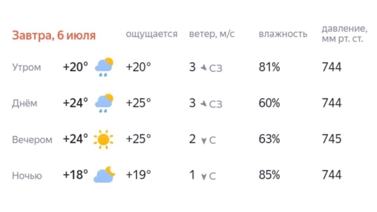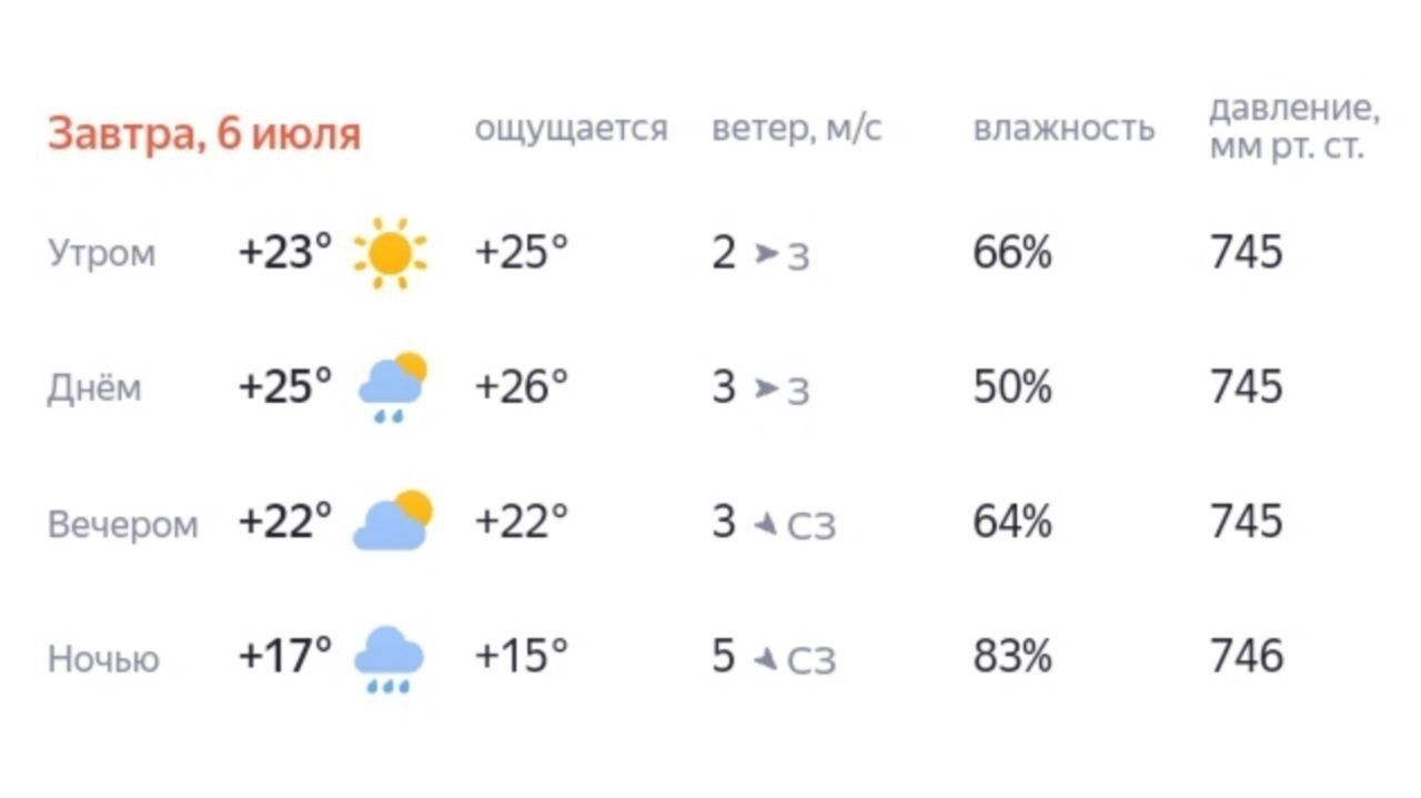 В воскресенье, 6 июля, средняя температура по Югре днем составит от +22 до +27 градусов, ночью — от +14 до +19 градусов. В северной части возможно похолодание, днем — +14…+19 градусов, ночью — +9 градусов. Также прогнозируют грозы и кратковременные дожди. Ветер — северо-западный, 3-8 м/с. Возможны порывы ветра до 14 м/с.