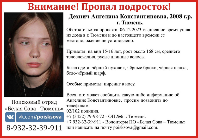 В Тюмени 6 декабря вечером пропала 16-летняя девочка. Об этом сообщили в поисковом отряде «Белая Сова-Тюмень» в соцсети «ВКонтакте». Также 6 декабря 15-летняя Ангелина Дехнич ушла из дома и не вернулась.