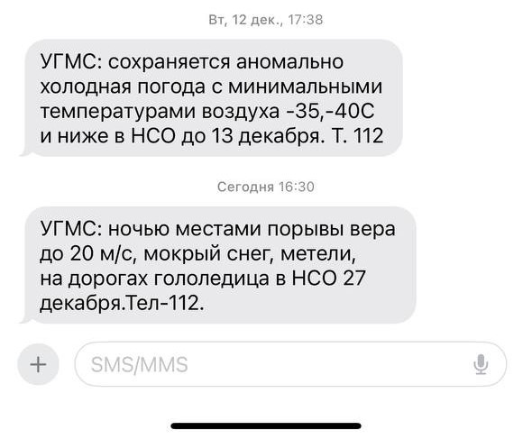 Новосибирцы получили СМС об ухудшении погоды в регионе. Оно ожидается в ночь на 27 декабря.