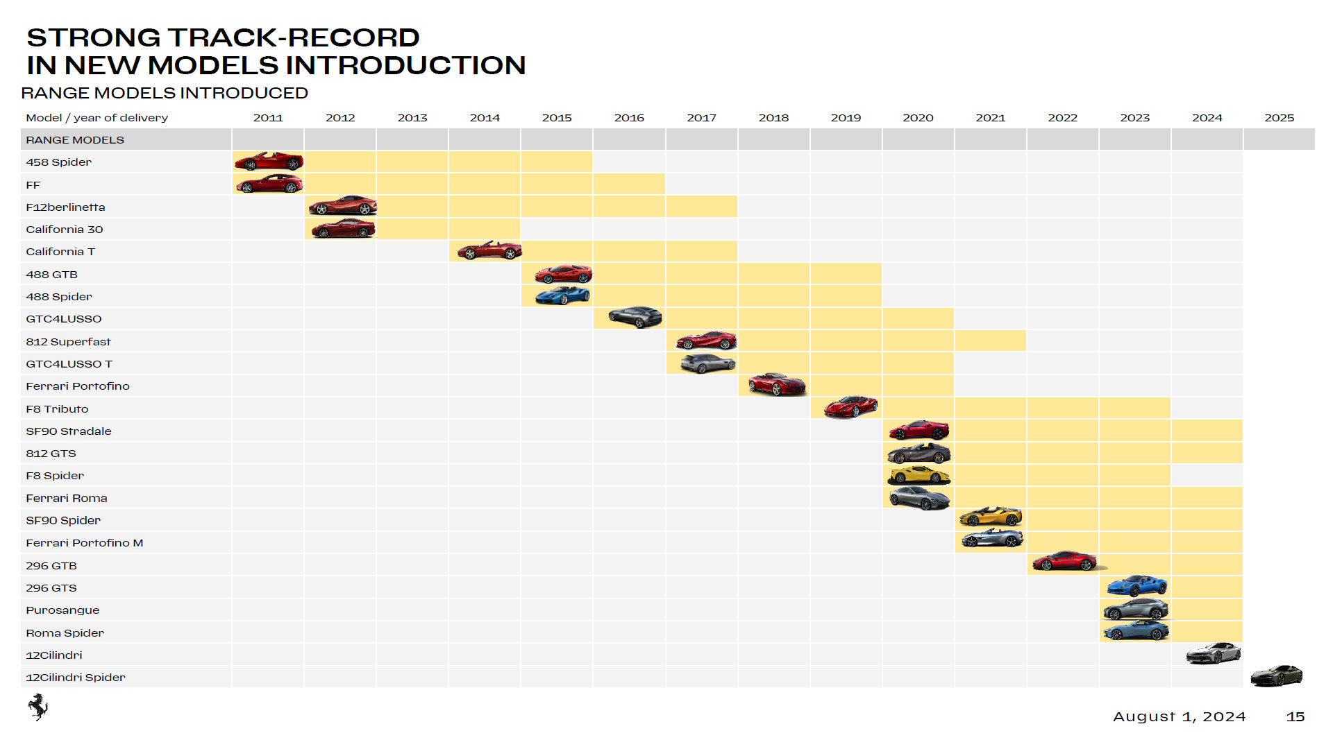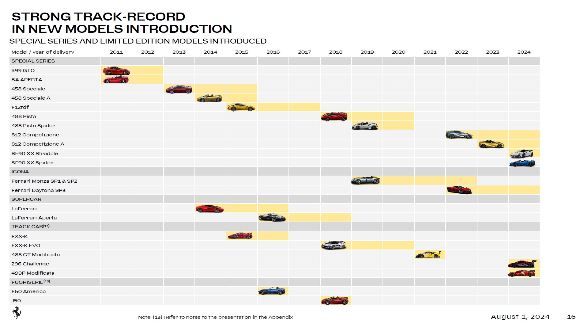 На днях компания Ferrari опубликовала подробный отчёт о своей работе в первой половине 2024 года, куда помимо финансовых показателей включена информация о пертурбациях в модельной линейке. Соответствующие слайды (см. ниже) показывают, что у Ferrari сейчас больше моделей, чем у иных массовых марок — например, Fiat, Ford и Opel. Заметим, что в продуктовой линейке Ferrari есть регулярные модели с неограниченным тиражом (Слайд 1), лимитированные модели (Слайд 2) и штучные модели, созданные в рамках программа One-Off, последние в слайды модельного ряда не включены, но учтены в статистике продаж.