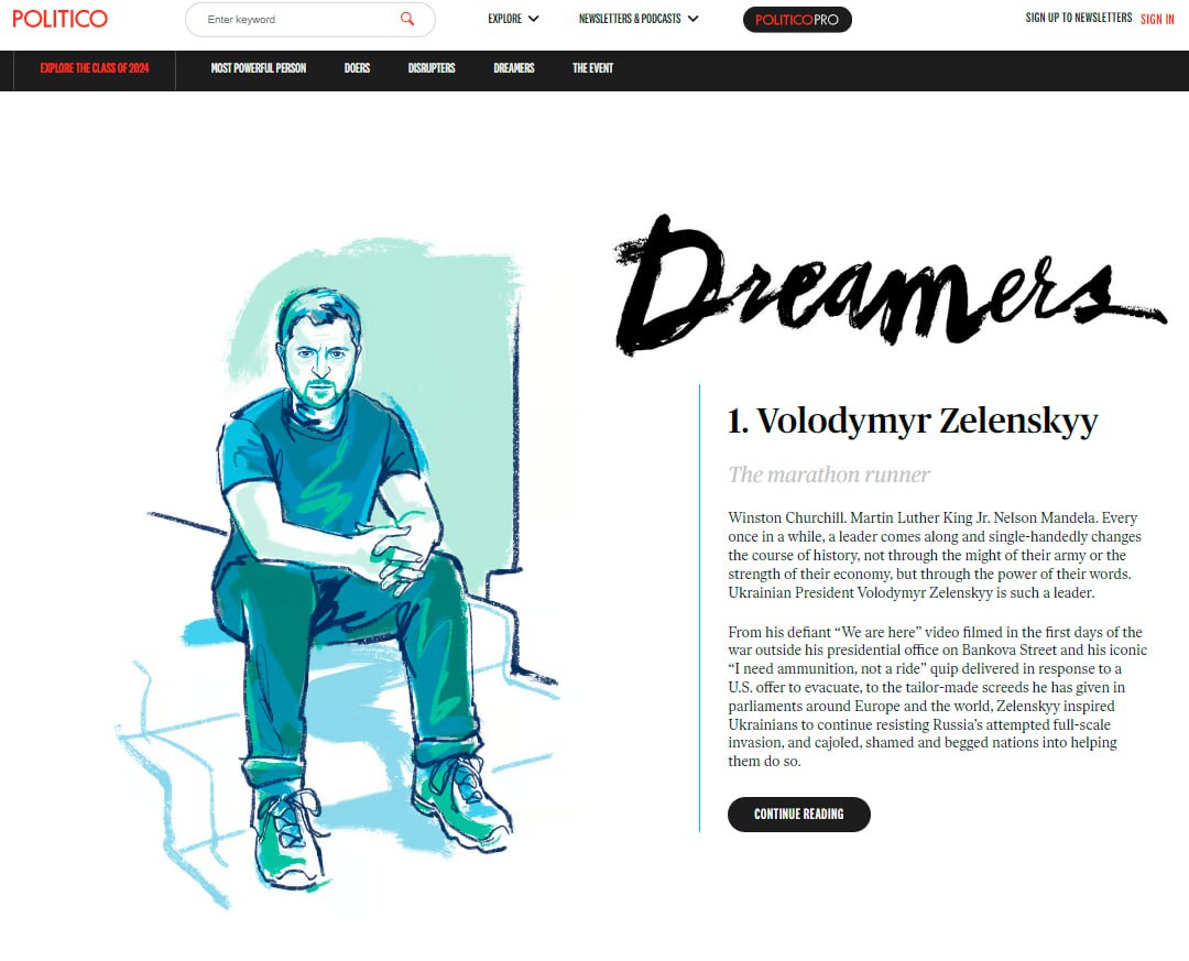 Издание Politico назвало президента Украины Владимира Зеленского «Мечтателем года», такое заявление было сделано на презентации рейтинга.
