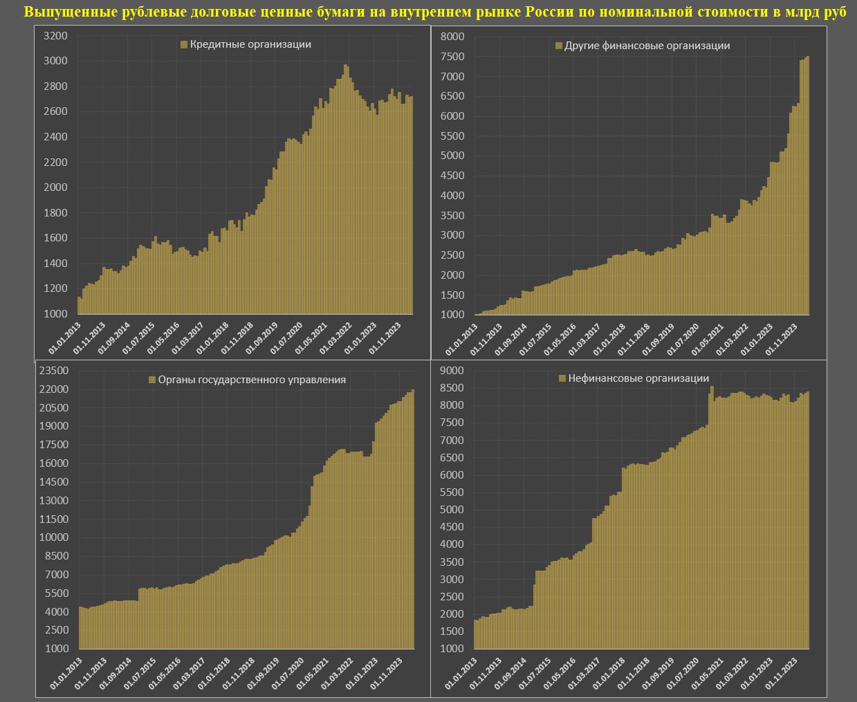 С начала СВО по март 2024 включительно чистая эмиссия рублевых облигаций по всем эмитентам составила 8.6 трлн или в среднем 330 млрд в месяц, за последние 12 месяцев – 5.1 трлн, с момента начала цикла ужесточения ДКП – 2.84 трлн (406 млрд в месяц), а с начала года – 674 млрд.