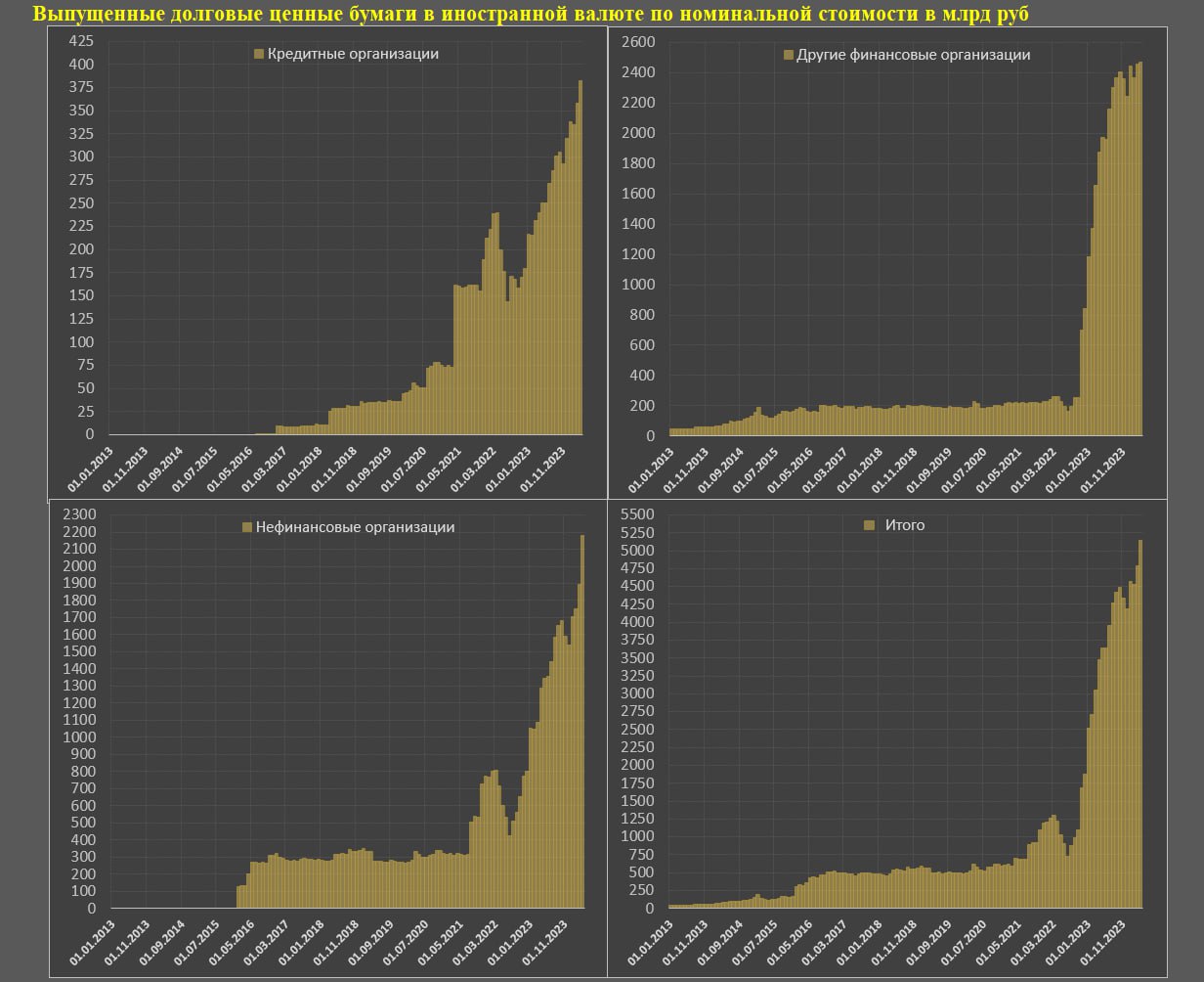 • Нефинансовые компании практически не производили чистых заимствований – всего 50 млрд с фев.22, 274 млрд за год, 300 млрд с сент.23 и всего 40 млрд с янв.24. Для сравнения, в 2017-2021 среднемесячный прирост был 61 млрд, а с фев.22 обрушился до 2 млрд!