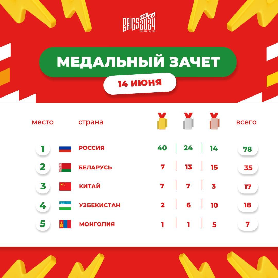 Россия продолжает лидировать в медальном зачёте по итогам второго соревновательного дня на Играх БРИКС в Казани