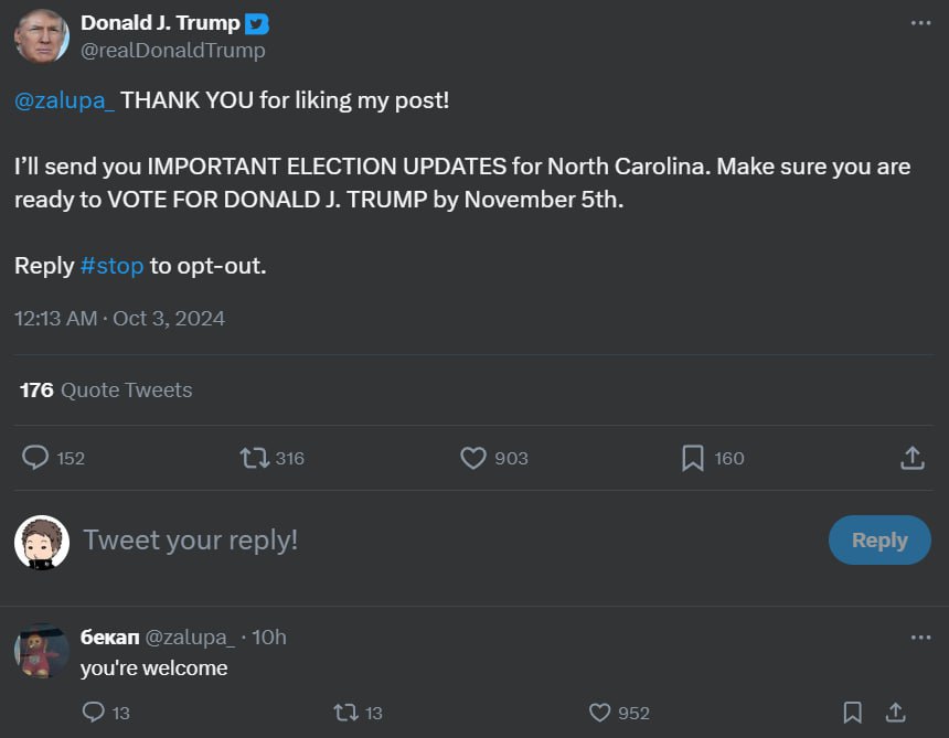 отправлять залупе важные новости о грядущих выборах. Юзер ответила «на здоровье».