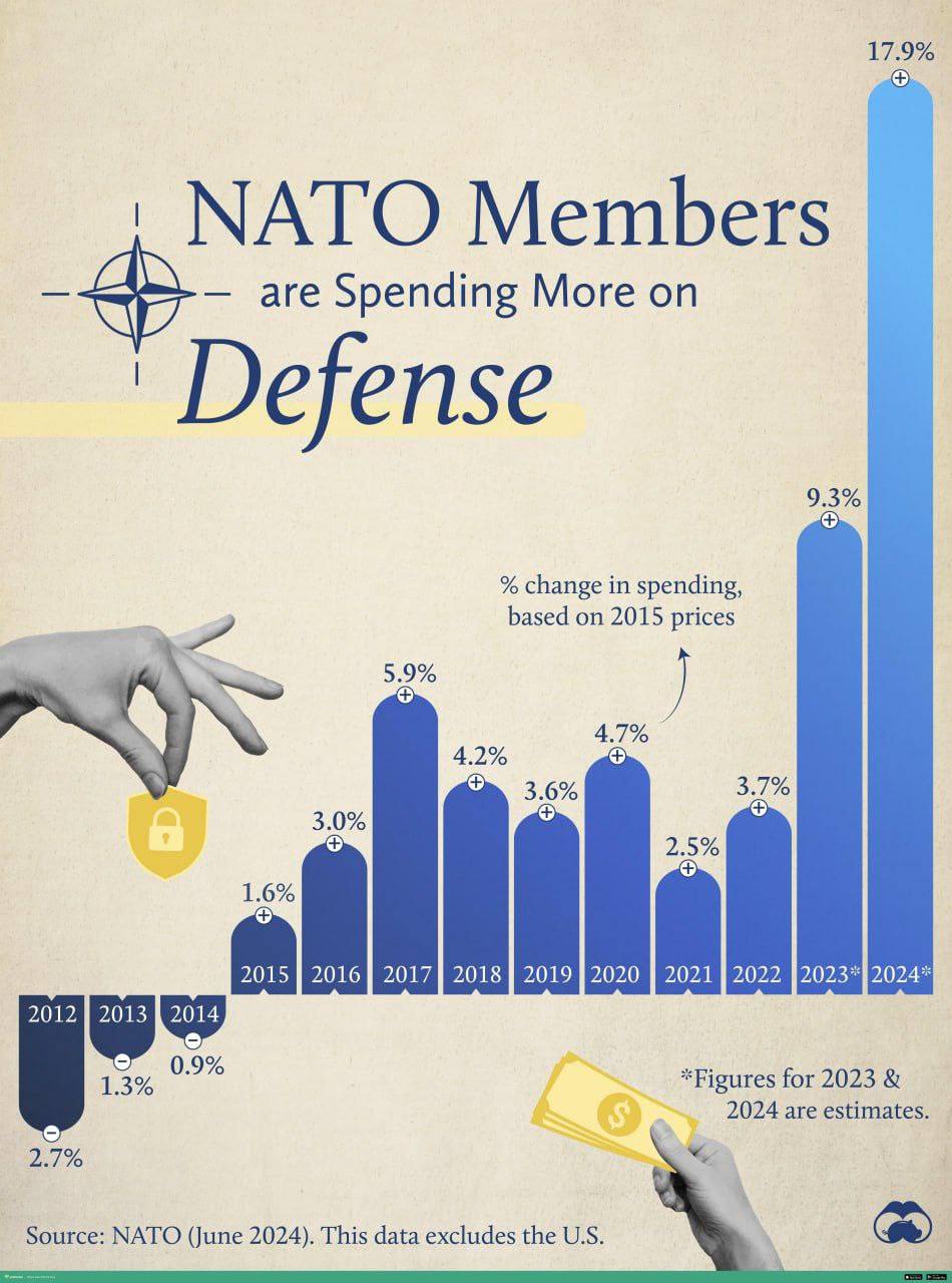 🙂Так выглядит рост расходов на "оборону" в странах НАТО 2012 по 2024 год