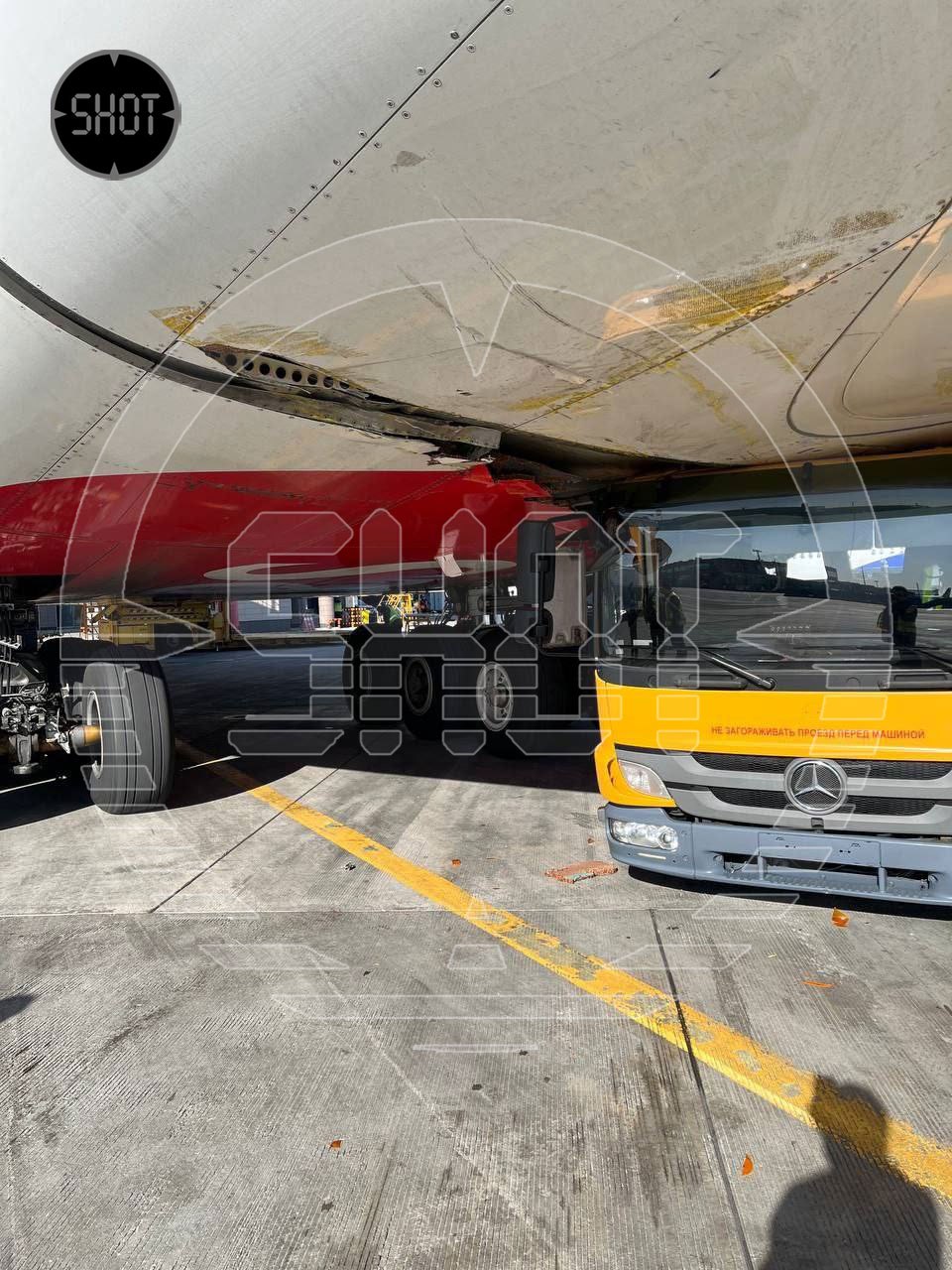 По данным SHOT, водитель спецмашины, который должен был заправить самолёт питьевой водой, перепутал педали и пропорол техникой фюзеляж. Мужчина госпитализирован.
