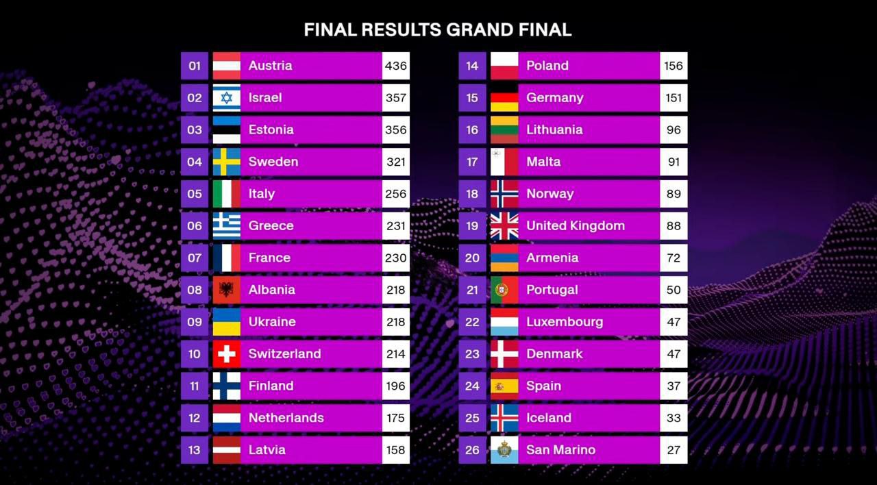 Победителем Евровидения-2025 стал австрийский певец Йоханнес Пич (JJ) с песней «Wasted love». Второе место занял Израиль, третье — Эстония, которую представлял Tommy Cash с вирусным треком Espresso Macchiato. Финал проходил в швейцарском Базеле.