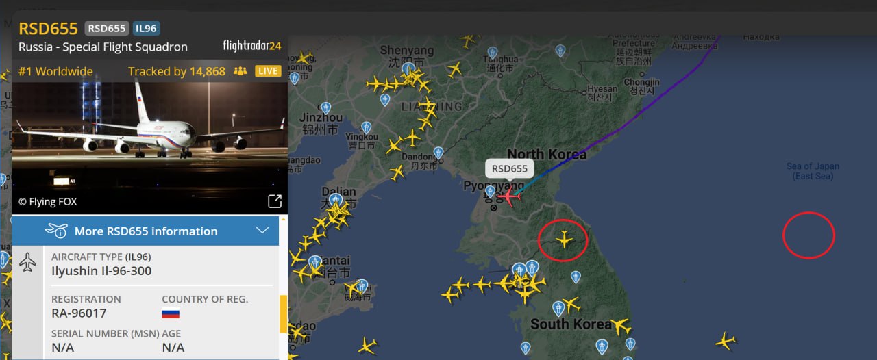 За визитом Президента России в КНДР следят как минимум два беспилотника — американский на границе и японский (в данный момент — с отключенным транспондером) над морем.