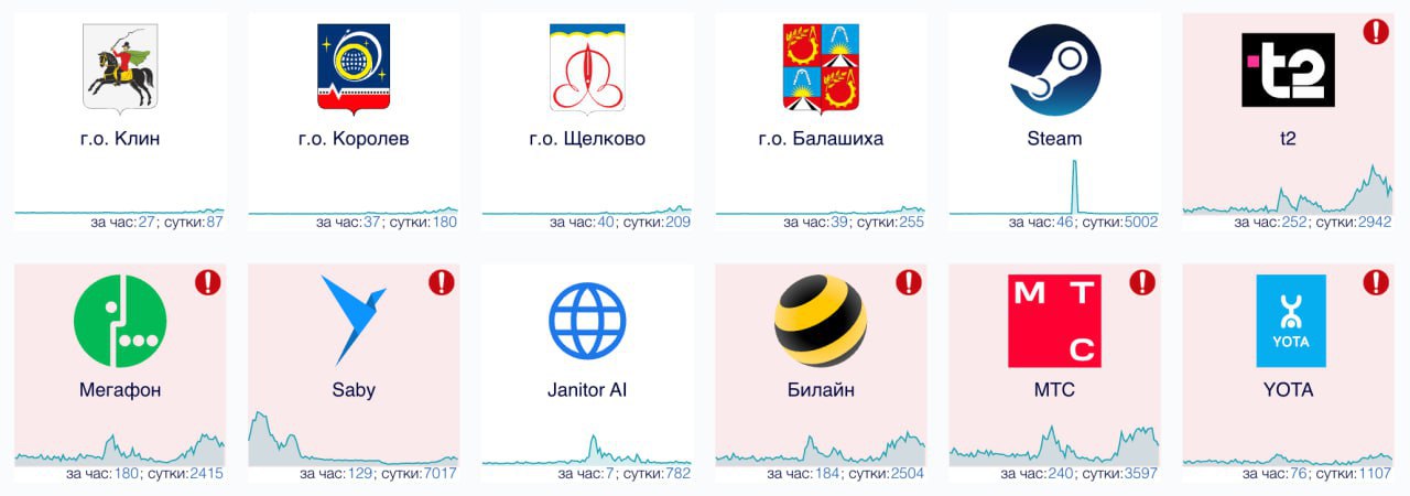 По данным мониторинга, проблемки наблюдаются у основных операторов мобильной связи. А также у "Госключа", системы "Контур", Steam. Предварительно, сбой связан с уничтожением беспилотников над стратегическими объектами.