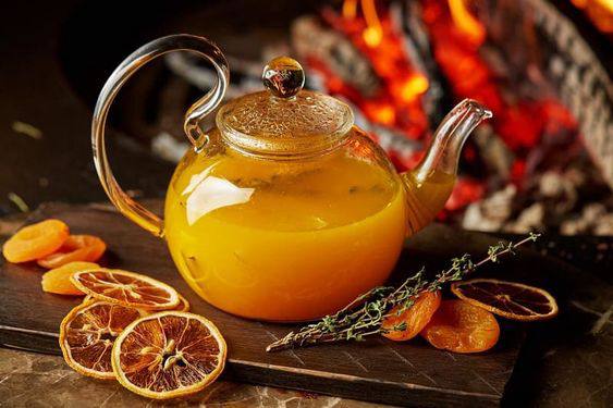 3. Выкладываем облепиховое пюре в чайник, добавляем дольки лимона (апельсина) и заливаем горячей водой. Настаиваем и добавляем мёд!