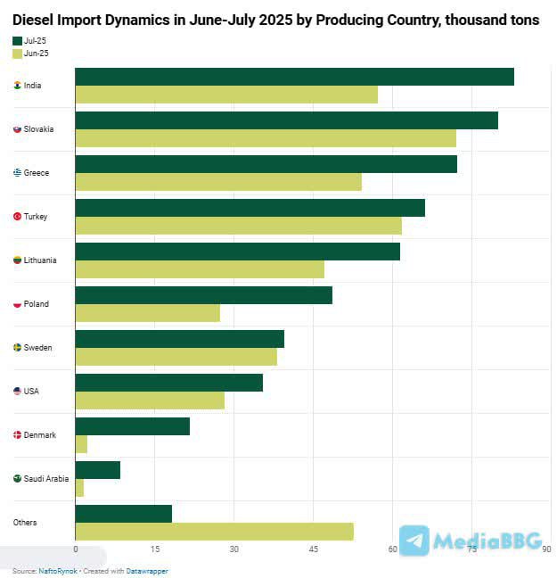 В июле 2025 года Индия стала крупнейшим поставщиком дизельного топлива на Украину, заняв 15,5% импорта (2,7 тыс. тонн в сутки)