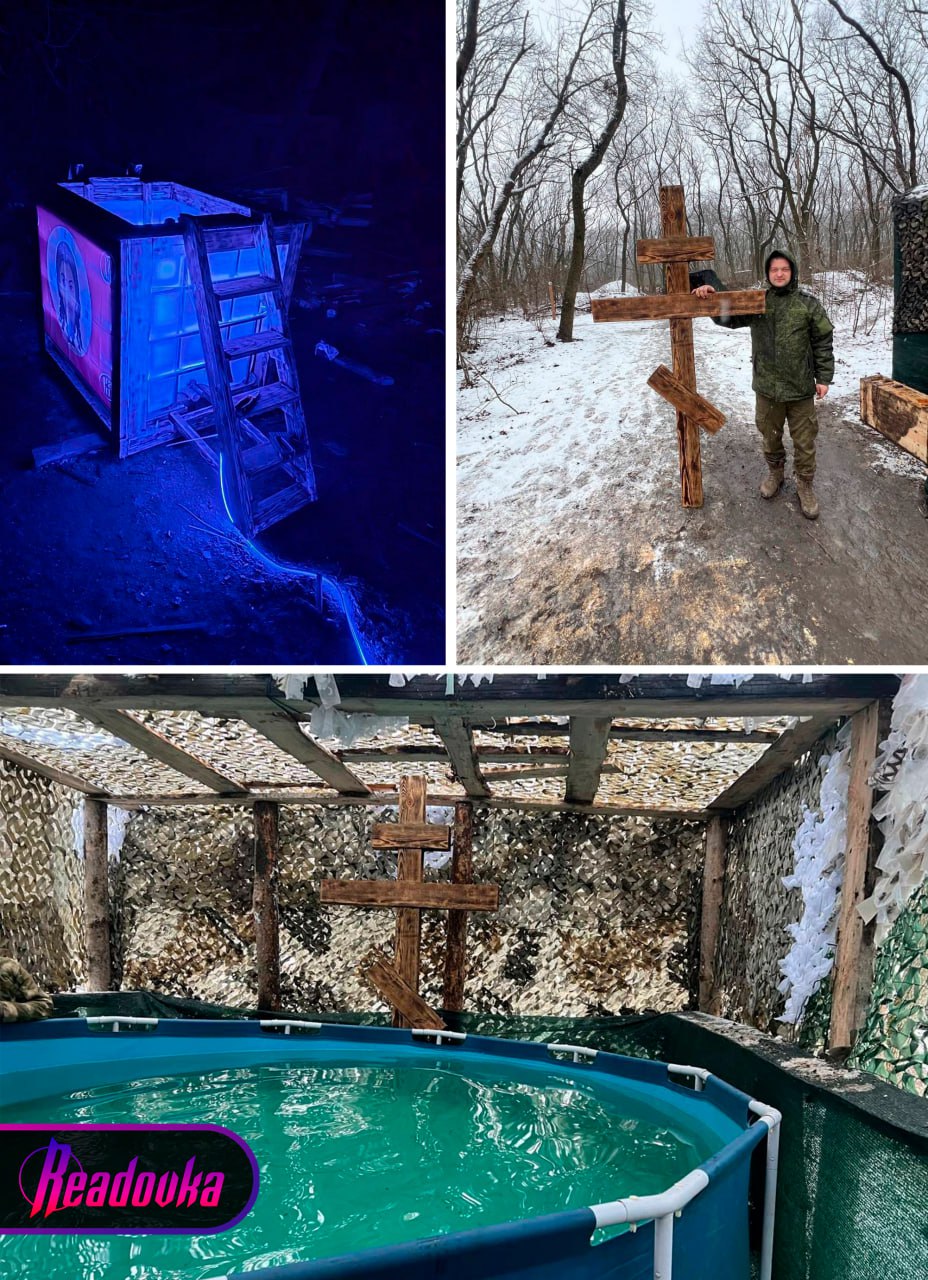 Бойцы русской армии на фронте готовятся отмечать Крещение Господне — православные воины построили купели. Десантники 299 полка соорудили небольшую деревянную купальню с ликом Спаса Нерукотворного. Кто-то из бойцов обходится обычным бассейном, скрыв его под навесом с маскировочными сетями.