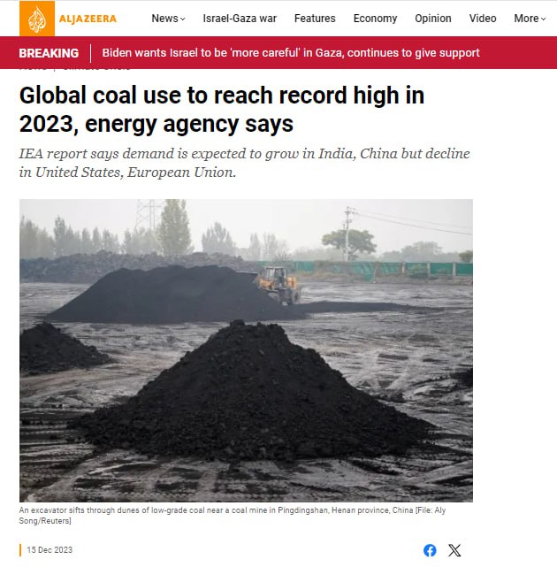 Aljazeera: мировое использование угля достигнет рекордного уровня в 2023 году, сообщает энергетическое агентство ( International Energy Agency — IEA).