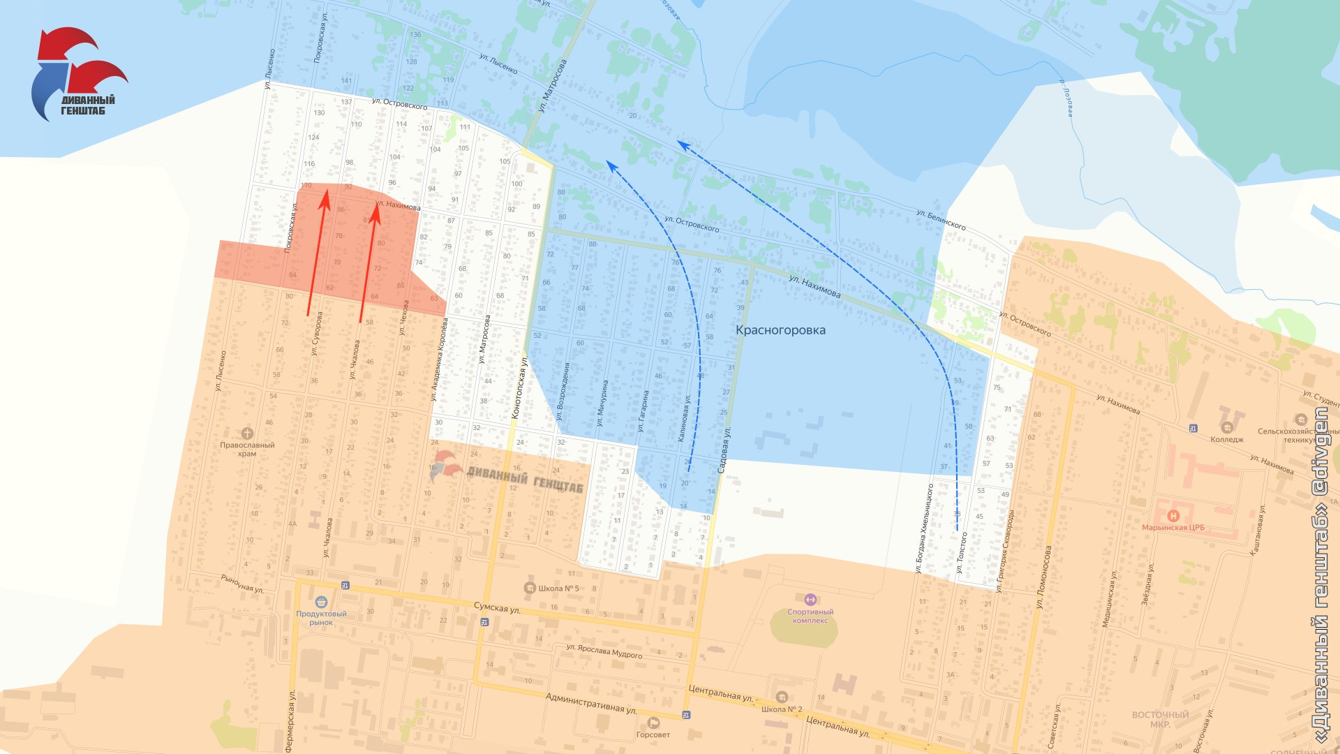ВС РФ продвинулись до ул. Нахимова в Красногоровке. Подразделения 79-й и 59-й бригад ВСУ начали отход из города под угрозой попадания в окружение.