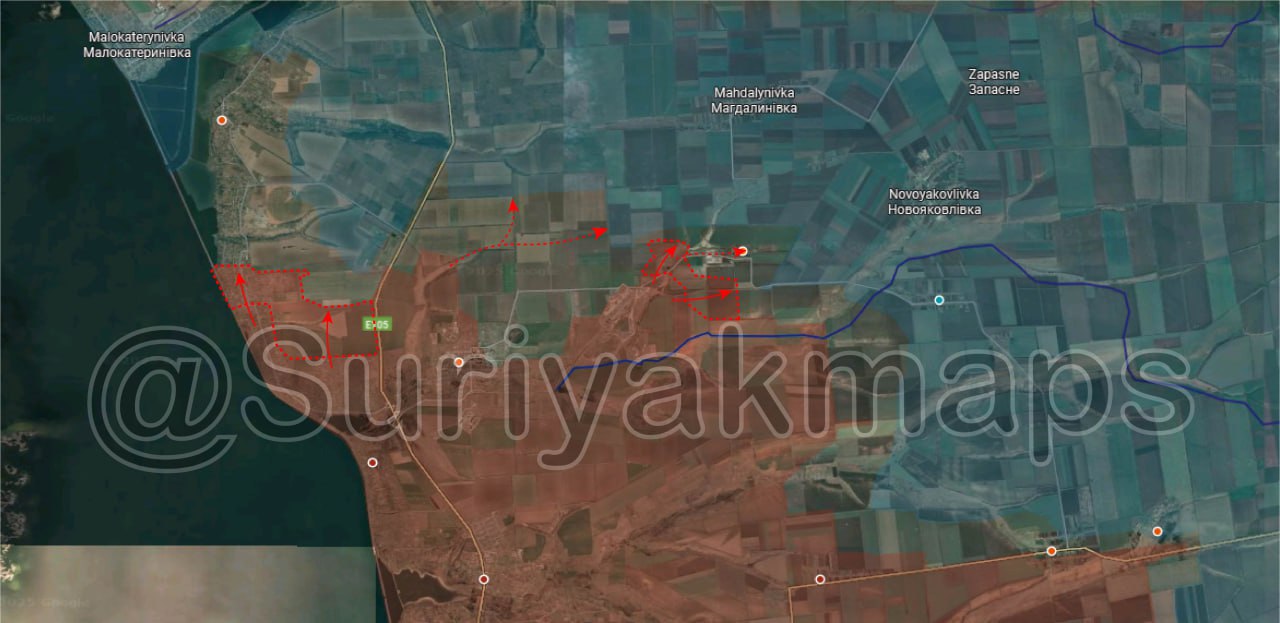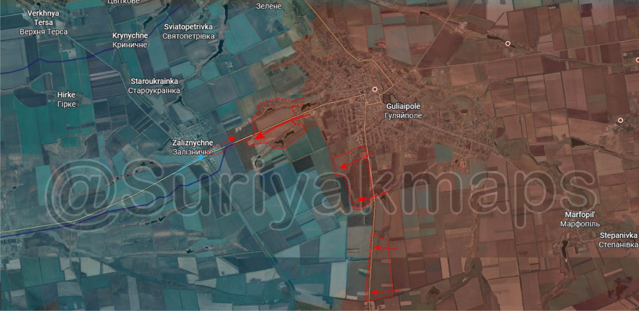 Ситуация на Гуляйпольском направлении: в течение последних четырех дней российская армия начала продвижение к западу от города Гуляйполе вдоль дороги Т-08-14, взяв под контроль серию траншей на этом направлении вплоть до первых домов посёлка Зализничное. Кроме того, российская армия продолжила продвижение к югу от города и начала взятие новых траншей.