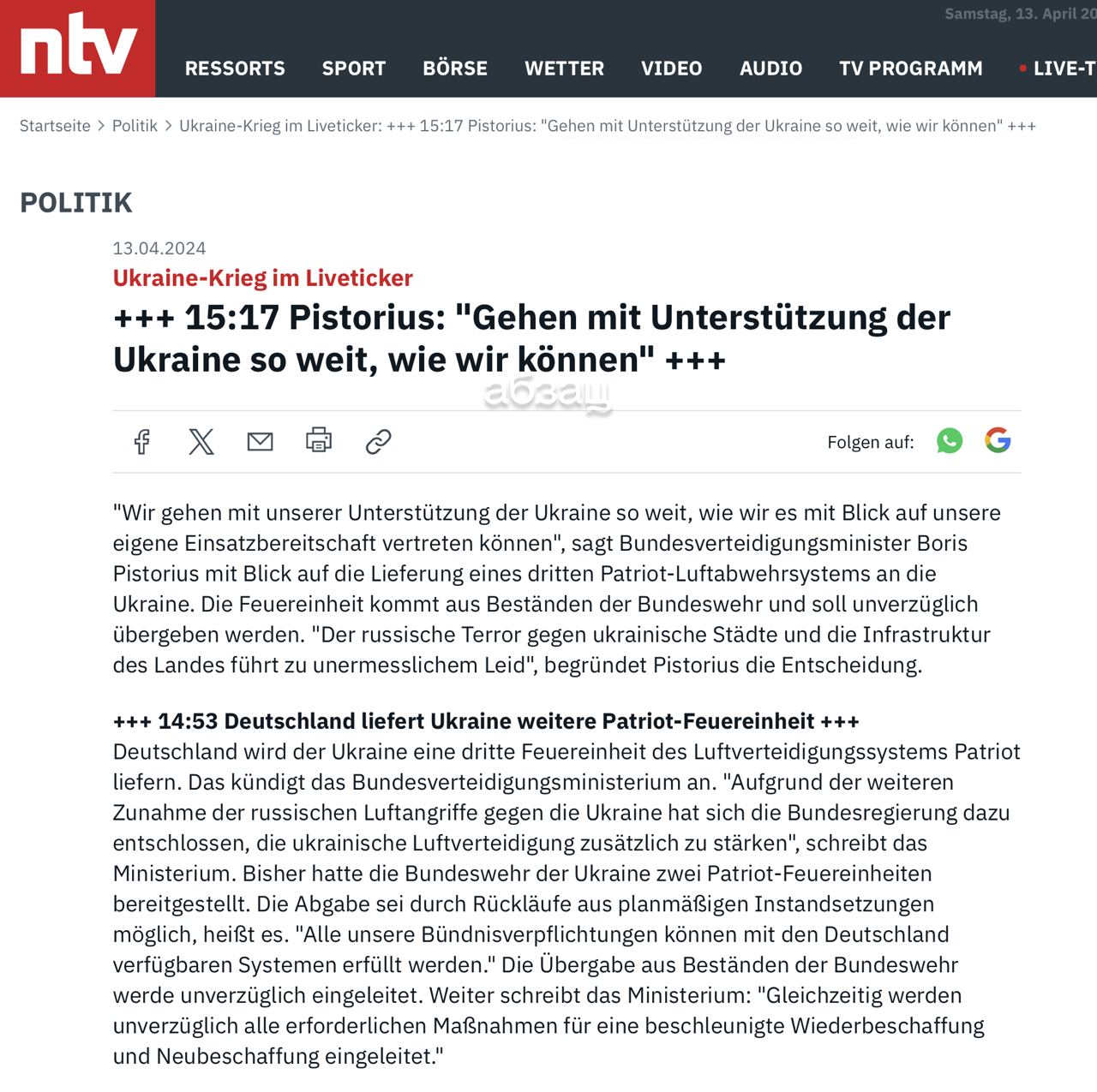 Министр обороны ФРГ расщедрился и заявил о поддержке Киева «настолько, насколько это возможно», говоря о передаче аж третьей системы Patriot. Видать, так боится потерять место, что вцепился зубами в свой стул.