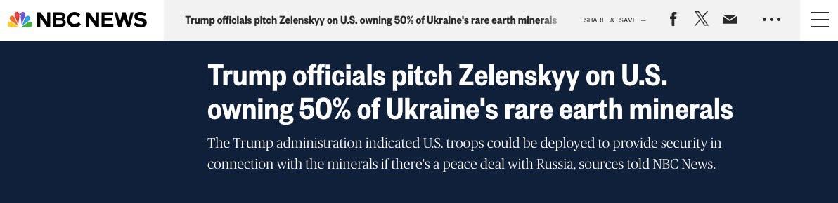 NBC News: Администрация Трампа предложила Украине передать США 50% прав на редкоземельные минералы, добываемые в стране, а также разместить американские войска для их охраны в случае мирного соглашения с Россией.