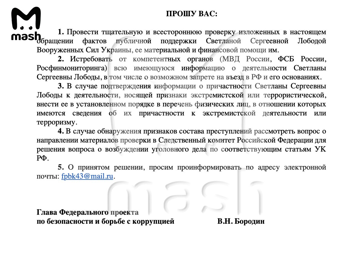 Общественники просят Генпрокуратуру проверить Лободу и рассмотреть вопрос о внесении в список террористов и экстремистов. Отдельно просят заняться Дробиной, которая платила украинке гонорар. Эти деньги могли пойти на поддержку ВСУ — Лобода неоднократно заявляла о финансировании армии Незалежной.