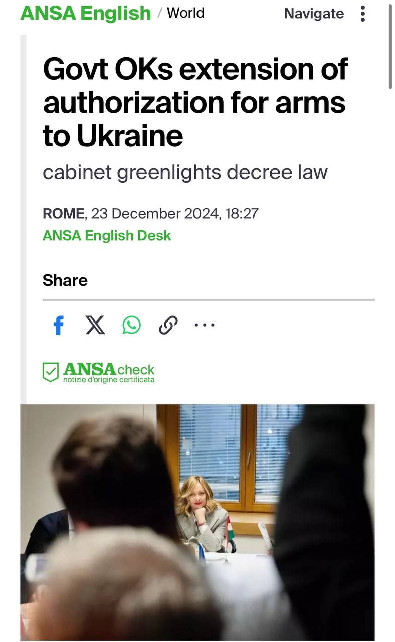 Правительство Италии одобрило продление разрешения на поставку оружия в Украину, — ANSA