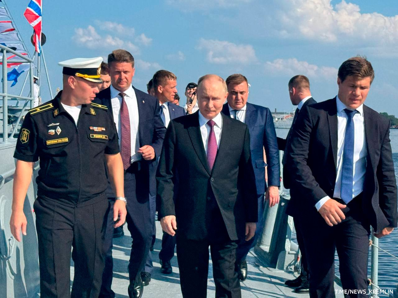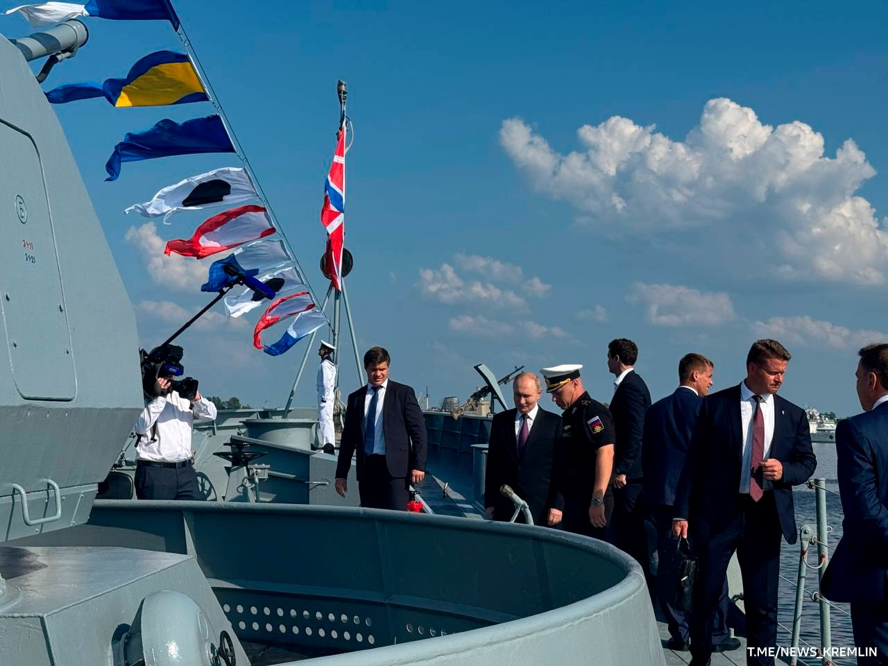 Кремль опубликовал фото Владимира Путина в Кронштадте на фрегате "Адмирал Григорович", который отражал сегодняшнюю атаку дронов на Ленобласть.