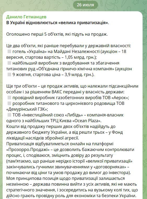 Кроме того, украинские власти выставили на продажу три промышленных компании, добывающие титан: «Демуринский ГОК», «Объединенная горно-химическая компания», «Аэрок».