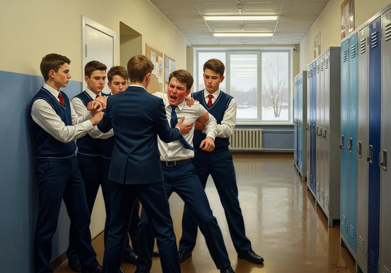 Несколько детей удерживают Максима, один из них пытается стянуть с него брюки. Когда это сделать не получается, завязывается драка — она продолжалась ещё несколько минут