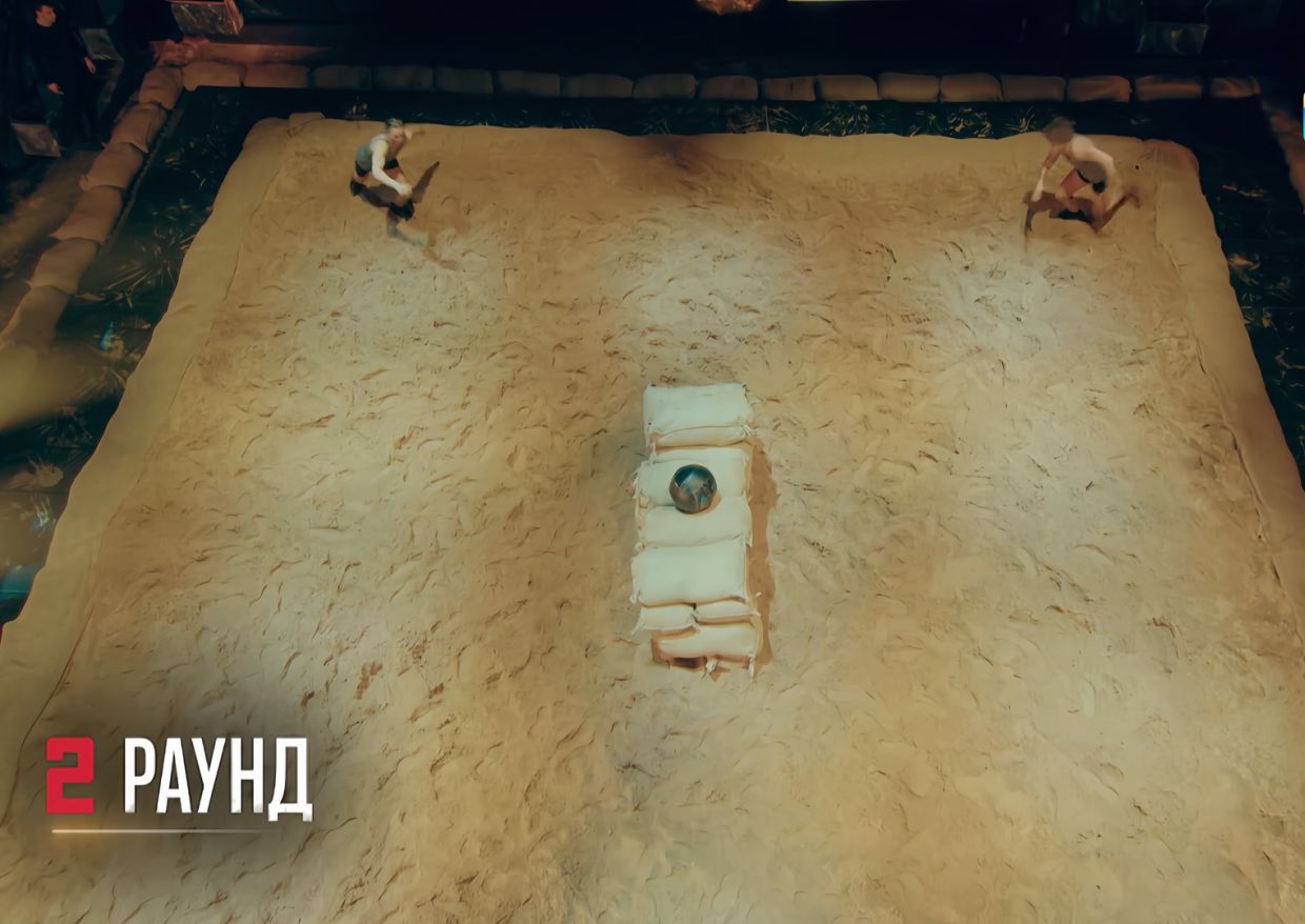 В центре площадки установили набивной мяч, участникам нужно было схватить его и не дать соперникам отнять. Первый раунд длится 1,5 минуты, выигрывал атлет, владевший мячом на исходе времени. Далее на площадке оставались два участника, они сражались за мяч на тех же условиях. Один проигравший покидает проект.