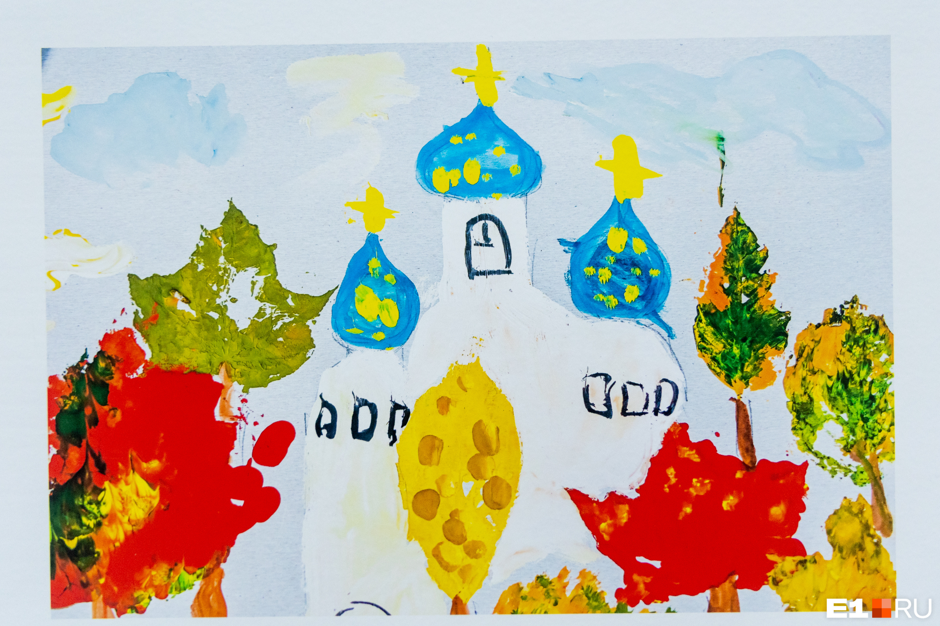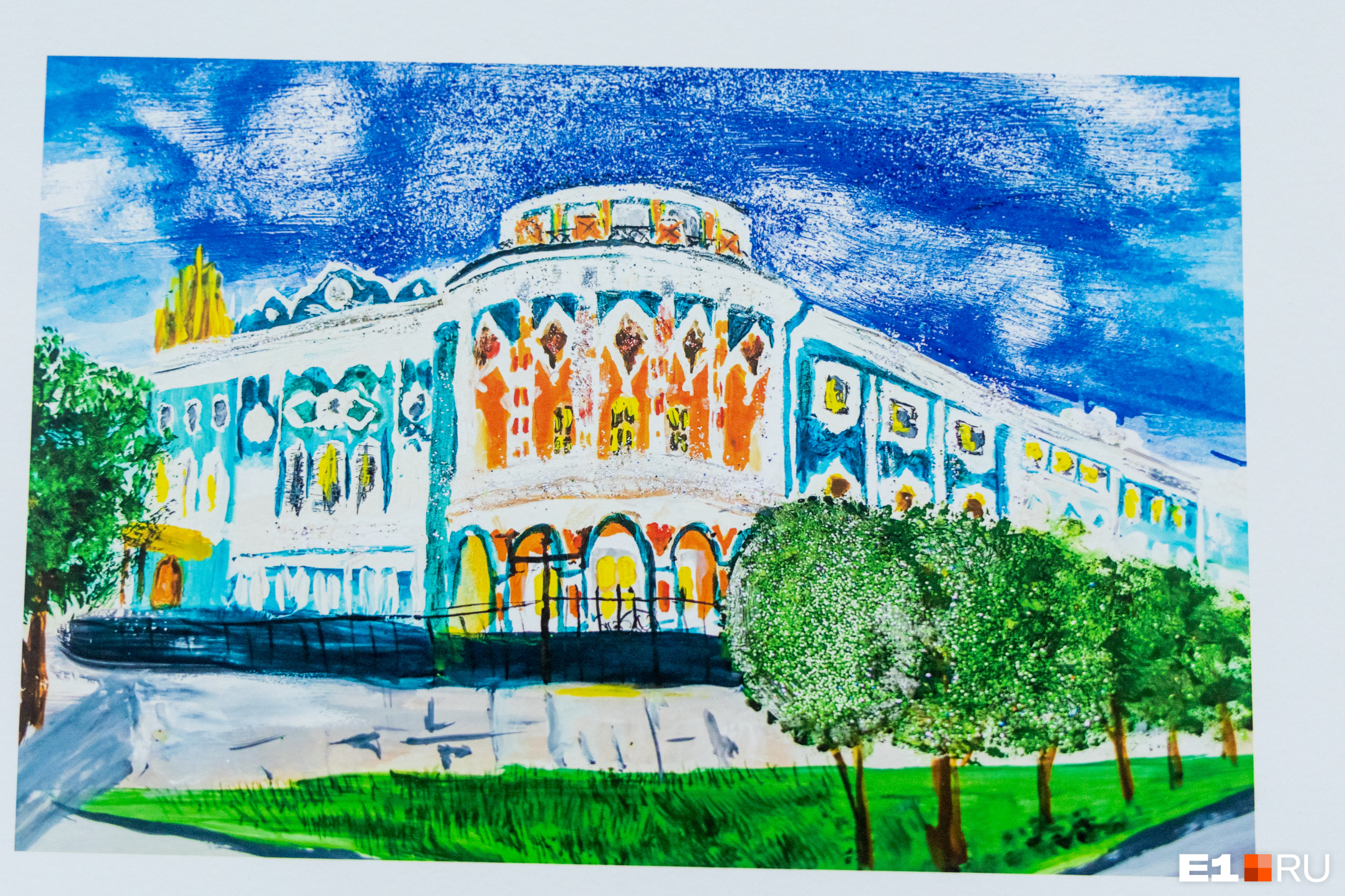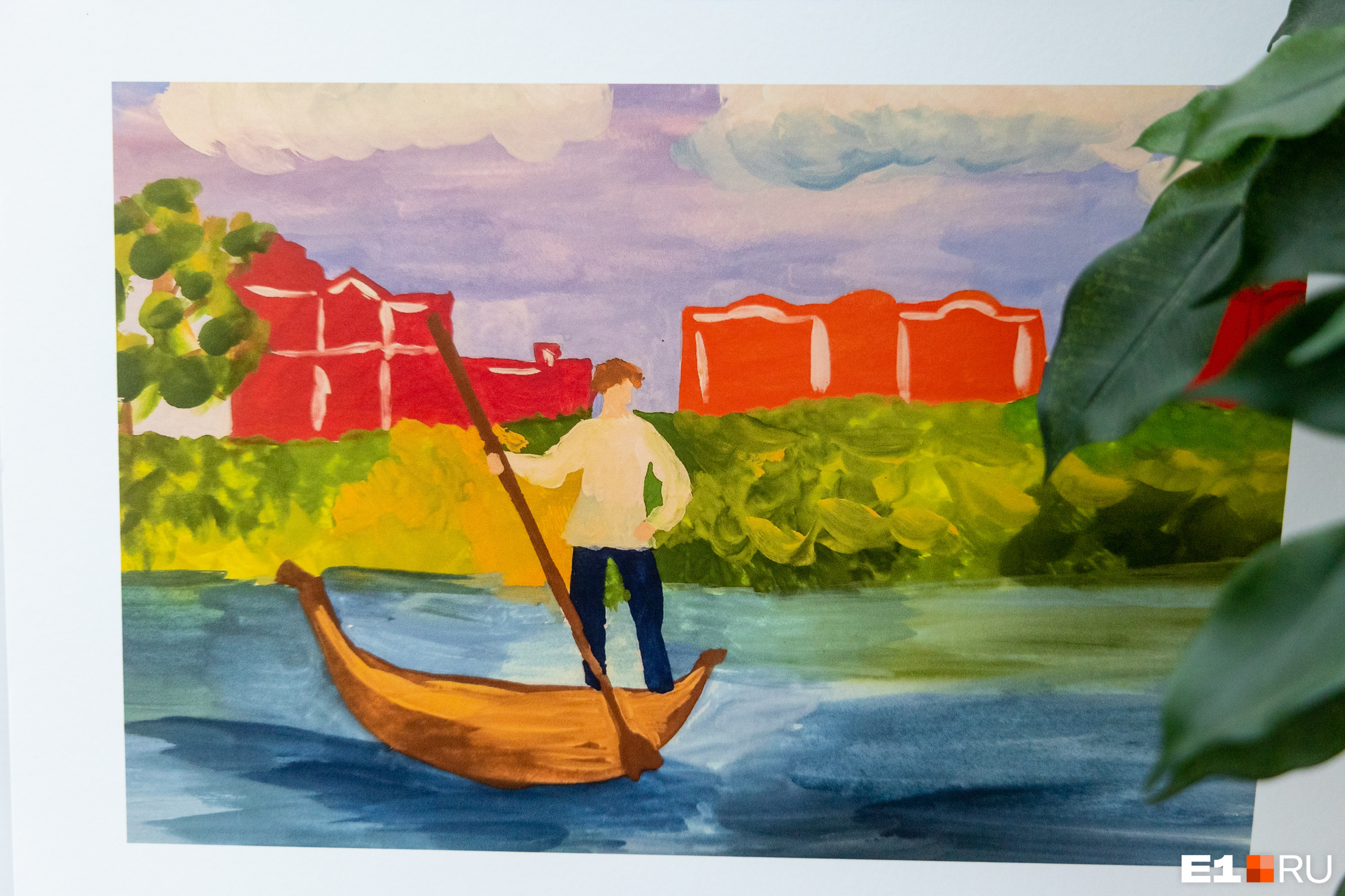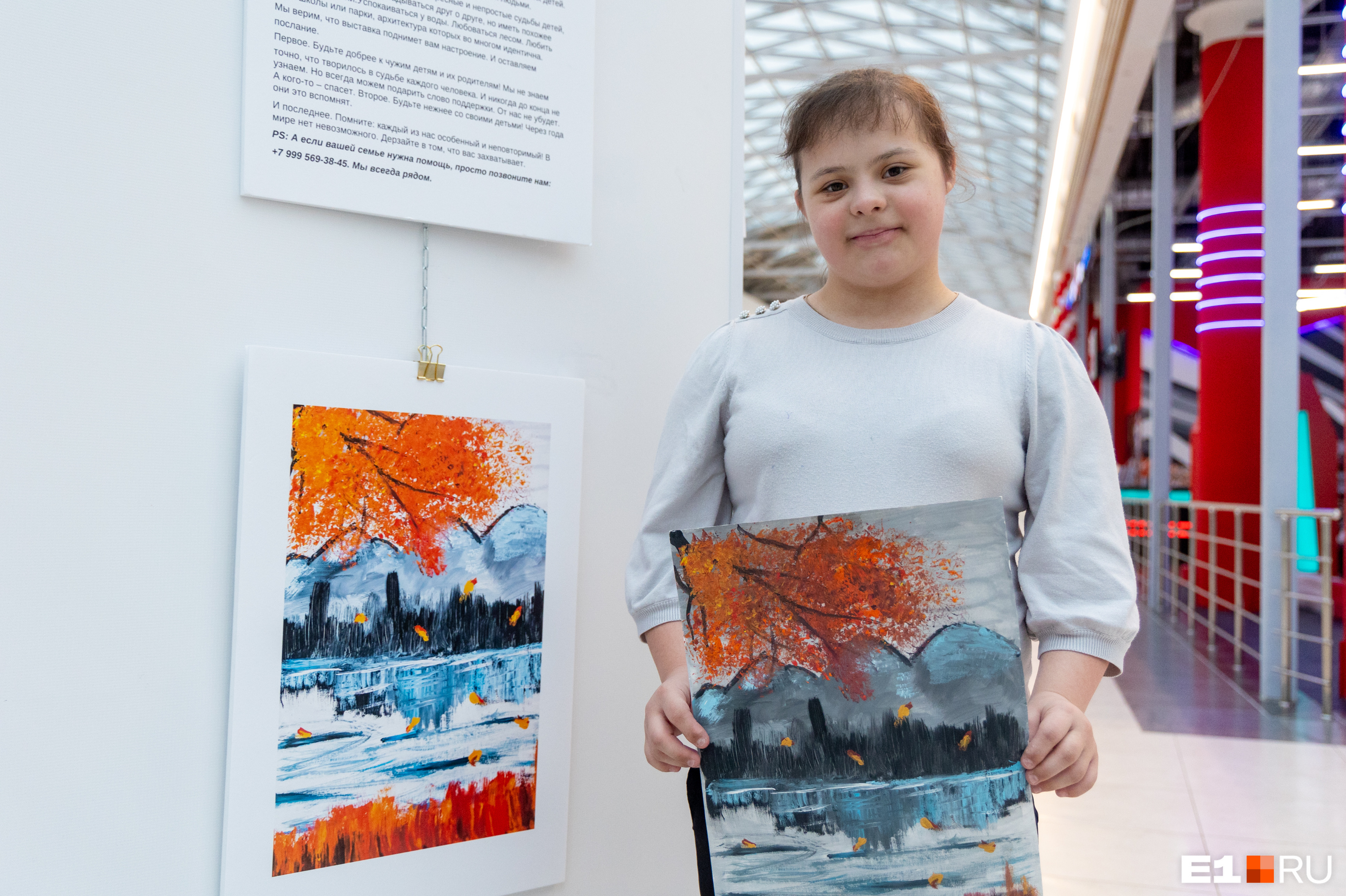 Даше Ваулиной 15 лет, у нее синдром Дауна. Девочка нарисовала осеннюю набережную города. Среди высоток угадывается башня «Исеть».
