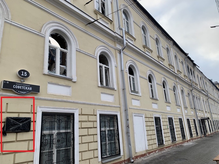 Черная пленка была на табличке и во время пожара. После того, как госпиталь сгорел и перестал работать, табличку решили открыть широкой общественности.