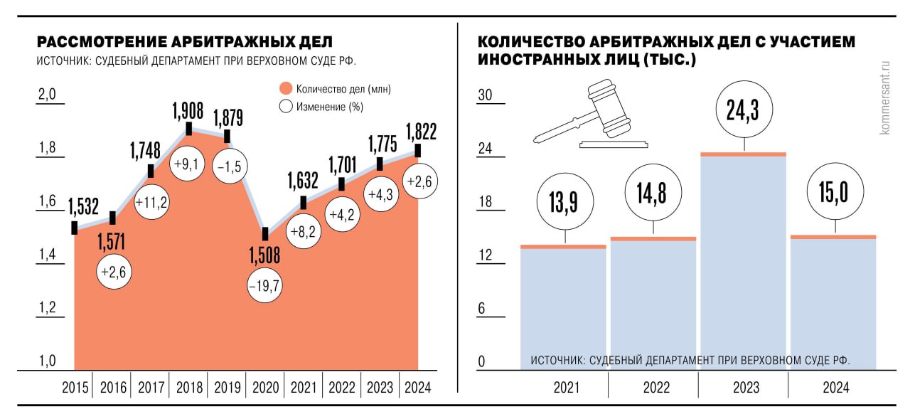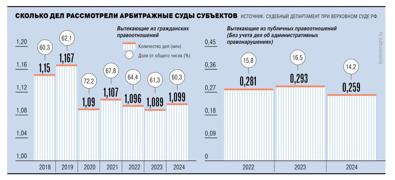 👉 Подробнее о том, какие виды споров и с каким результатом рассмотрели арбитражные суды в 2024 году, читайте в материале «Ъ»