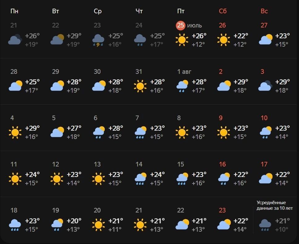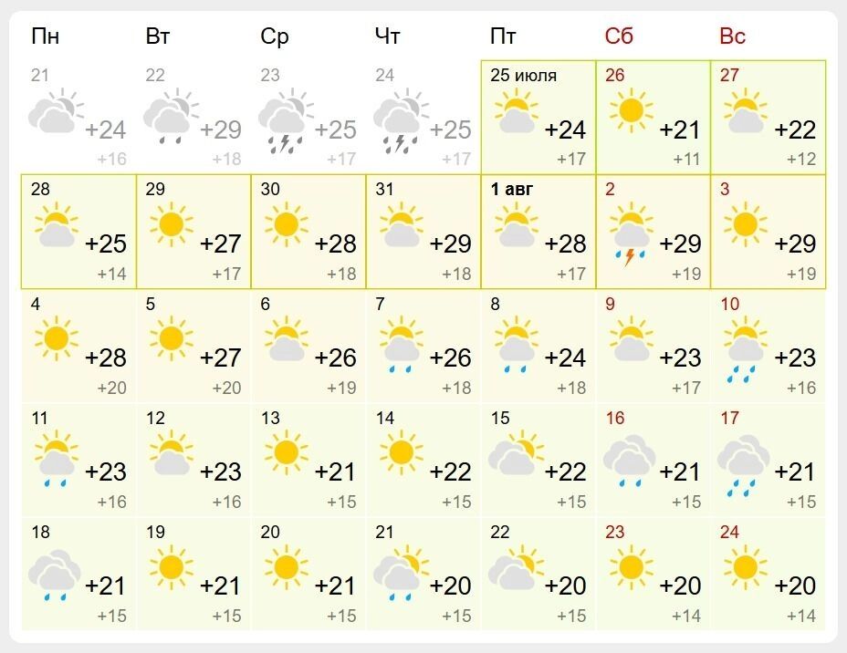 Похожий прогноз погоды на август дает и Gismeteo. По их данным, в Казани с 28 июля по 7 августа в столице Татарстана температура воздуха будет от 26 до 29 градусов. После этого сервис также прогнозирует небольшое «похолодание» — до 20-24 градусов. Отметим, что в обоих случаях прогноз погоды на август носит предварительный характер.