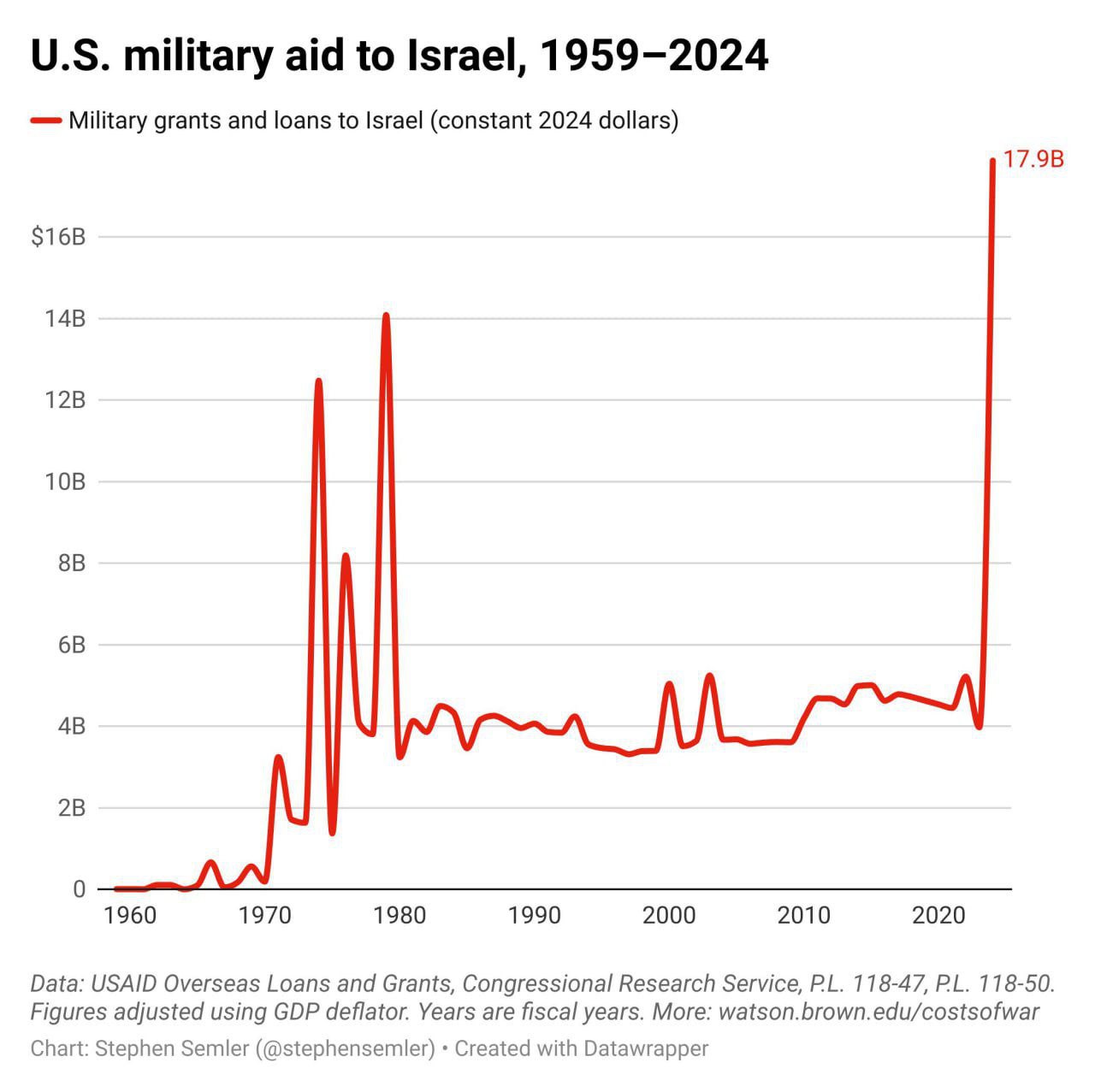 Израиль является крупнейшим получателем американской военной помощи в истории, получив с 1959 года $251,2 млрд с поправкой на инфляцию, говорится в докладе. Тем не менее, $17,9 млрд, потраченных с 7 октября 2023 года, стали самым большим объемом военной помощи, направленной Израилю за один год.