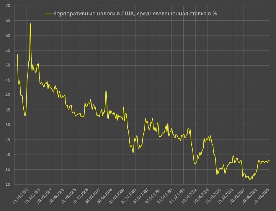 С 1947 по 1959 средняя ставка корпоративного налога была 44.4%, с 1960 по 2007 почти 30%.